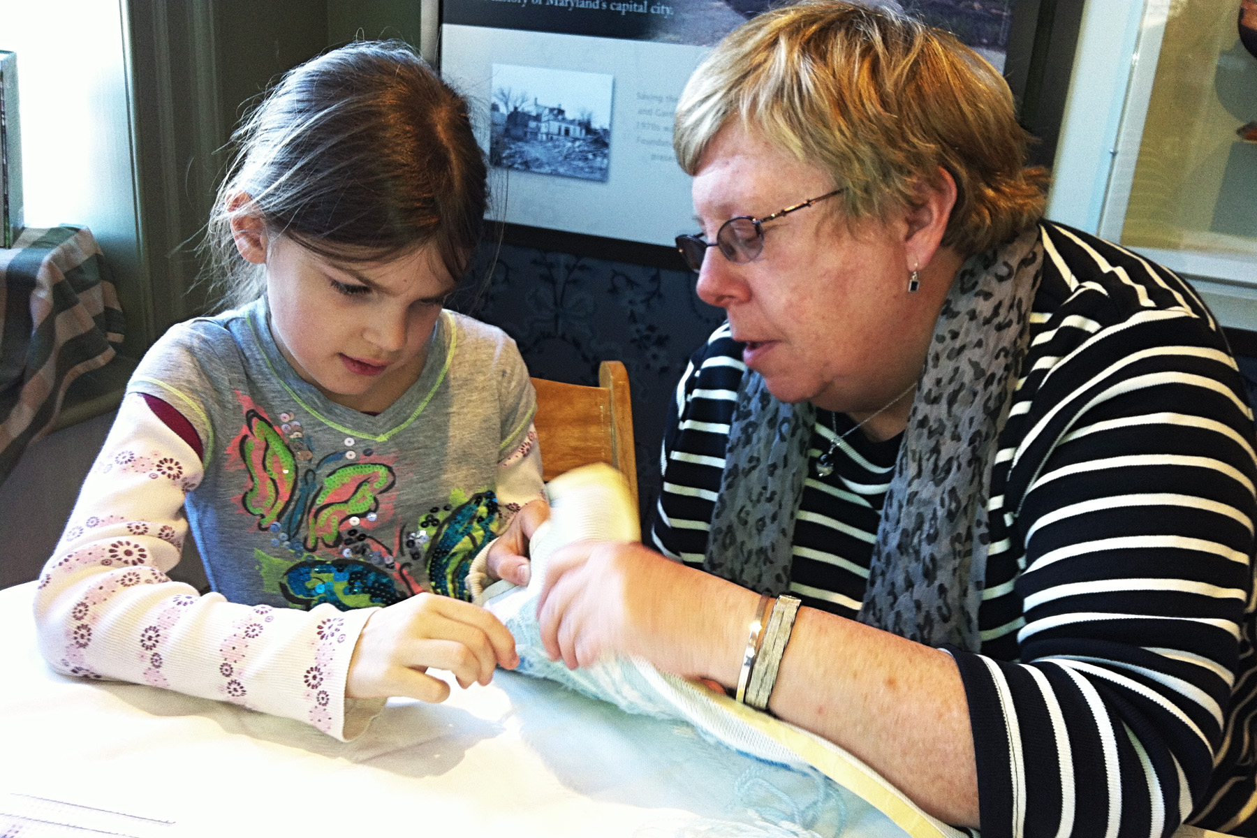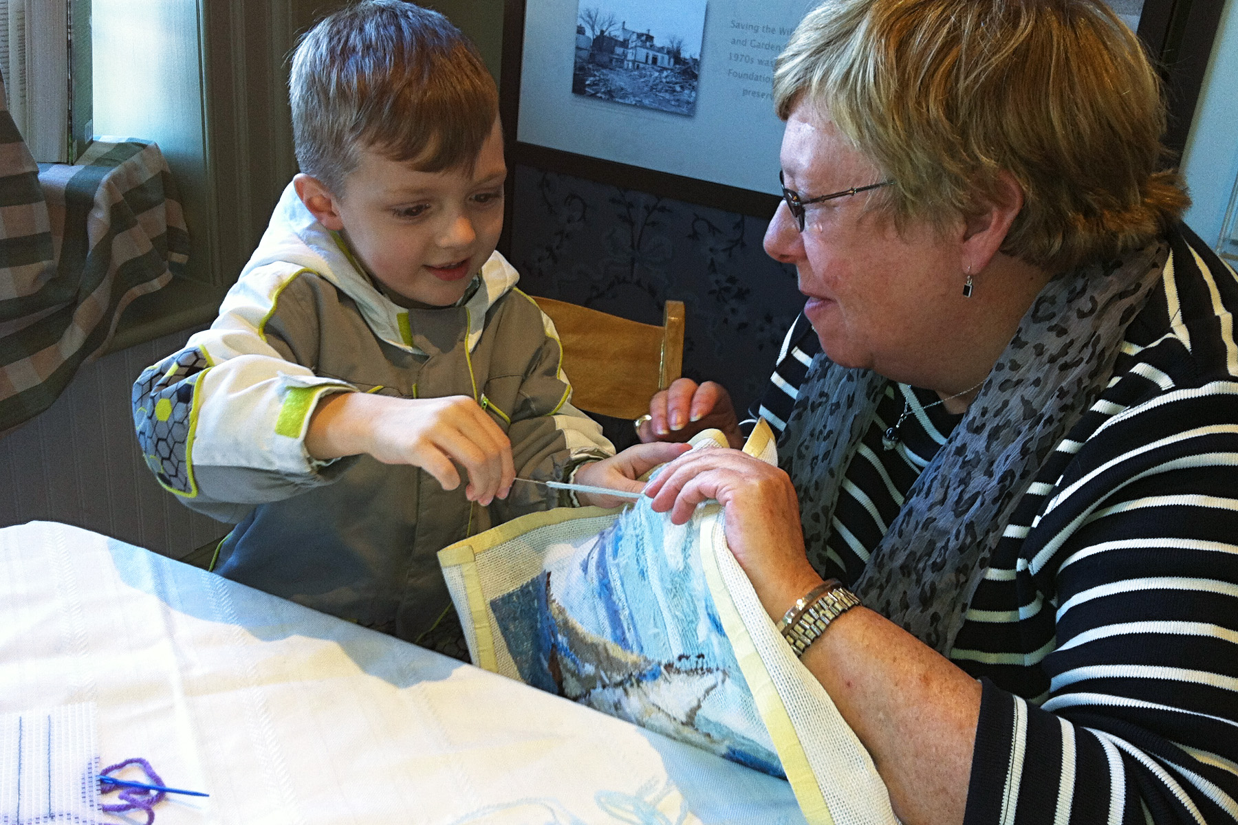 - Sheryn, Tapestry stitching volunteer, with visitor from France, MD Day